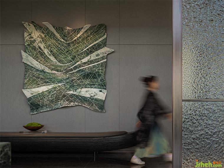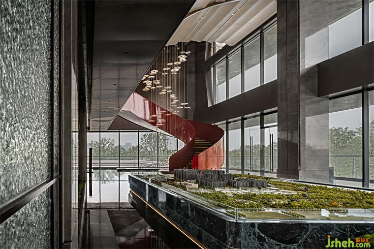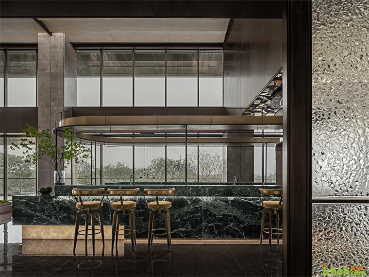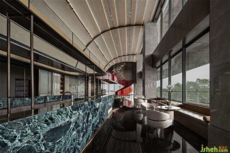 設(shè)計師在空間視覺的描繪上,往往是感性填充的,在這里,我們通過仿似拱形船艙的入口,看到波光粼粼的天空,這與真實的場景視乎有所偏離,這種江與天之間模糊的錯位的形象替換,正是設(shè)計師所思考的空間的詩性——秋水共長天一色之境。