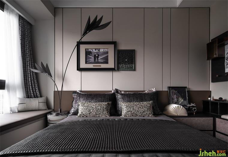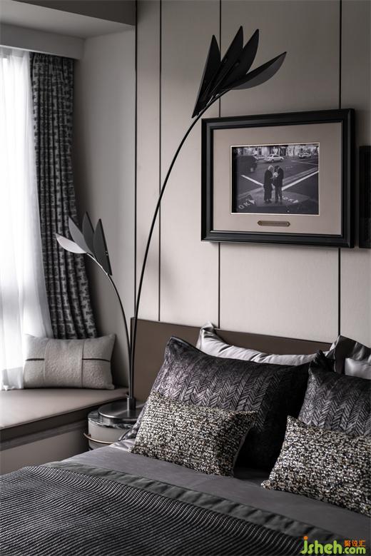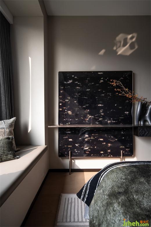 主臥更像是主人的一隅獨(dú)立天地,裝飾畫提取嶺南特色建筑經(jīng)典元素— —鑊耳屋結(jié)構(gòu)進(jìn)行重構(gòu),樣板房設(shè)計(jì)帶著對(duì)文化和記憶的共情、與時(shí)代生活的包容力,成就一方嶺南風(fēng)情天地。