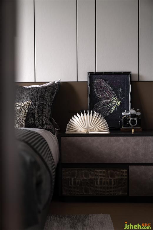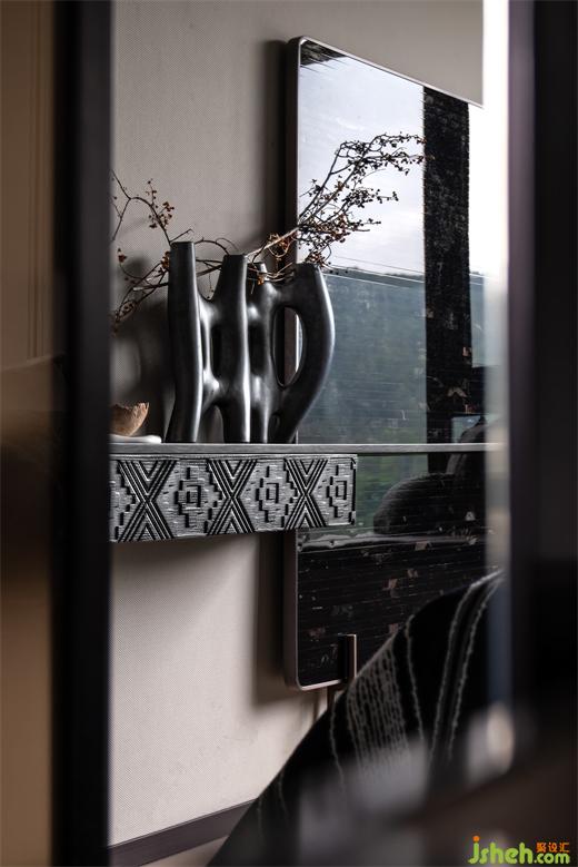 考慮到男主人品鑒和收藏的需求,設(shè)計(jì)師弱化了餐廳的邊界,樣板房設(shè)計(jì)增加了可供收藏、收納的餐邊柜,轉(zhuǎn)換為休閑家庭迷你吧。