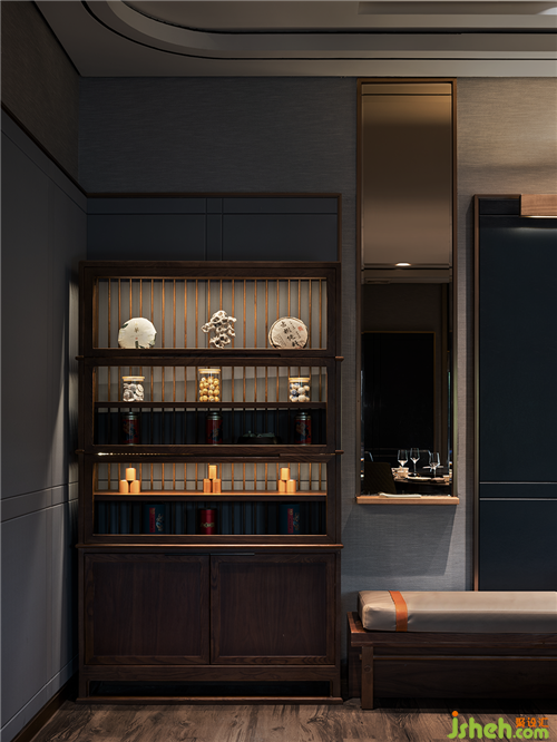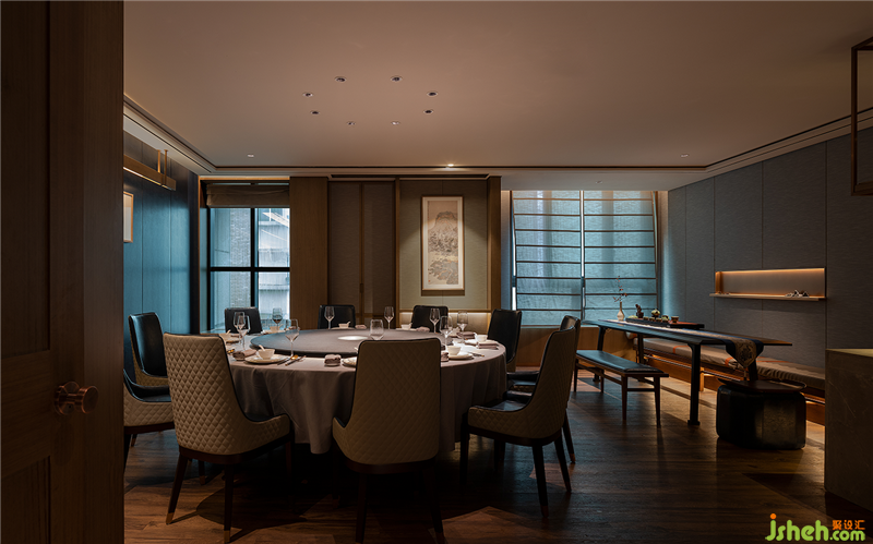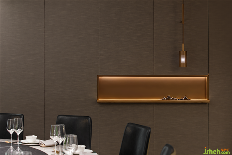 墻面的凹槽,內(nèi)嵌燈條,光灑在山體雕塑上,仿佛映出江天空曠的迷離之感,山頂上有金色點(diǎn)綴,可謂點(diǎn)石成金,縹緲的山色與云影共相浮動(dòng),傳遞了東方禪學(xué)的靜謐與幽玄,與墻上的山水畫相互呼應(yīng)。