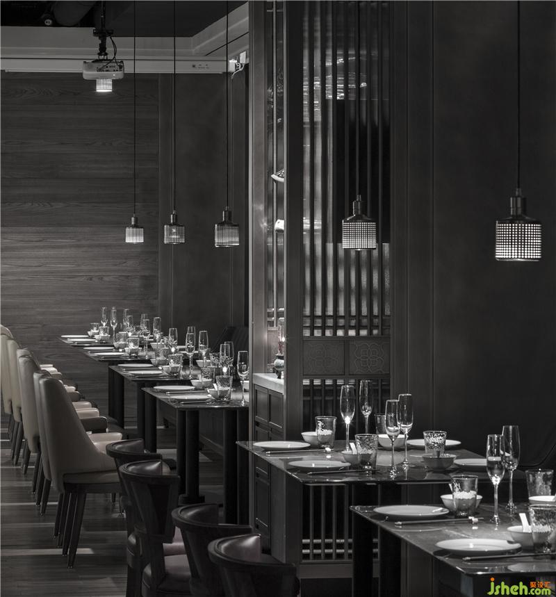 仿古格柵的黃銅屏風呈現(xiàn)半透的效果,以小空間作為大空間的收束,又可從小空間中形成視覺延伸,創(chuàng)造出獨特的私密氛圍,外側(cè)是江邊美景,內(nèi)側(cè)是觥籌交錯,朦朧優(yōu)雅,傳統(tǒng)與現(xiàn)代在此間融合。