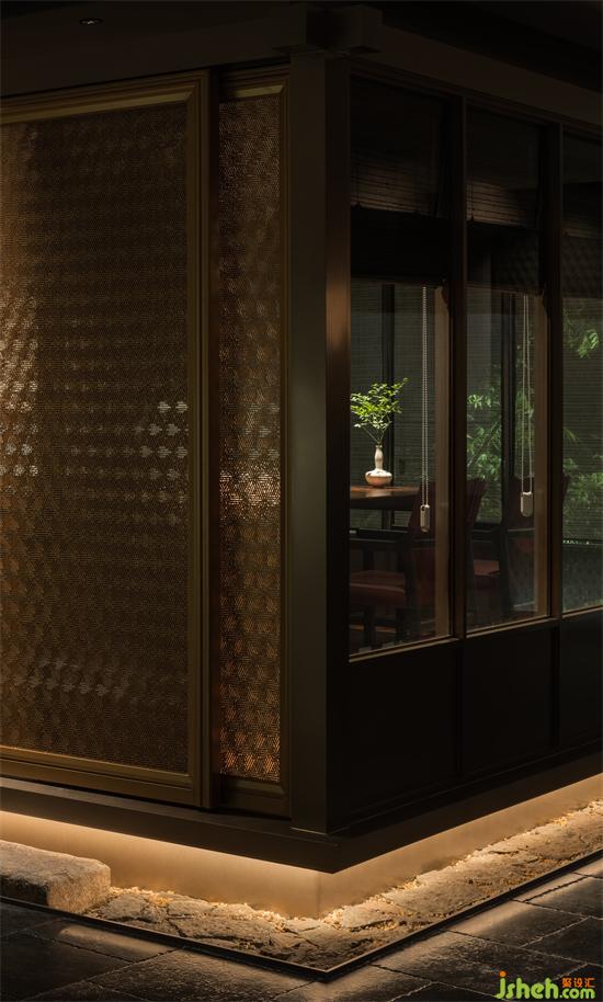 四周碎石鋪地,長燈環(huán)繞,如臨空起,借水榭形式,龍吟九品餐廳設(shè)計配以落地長窗,兩面借景,雖在城市而得山林之樂。