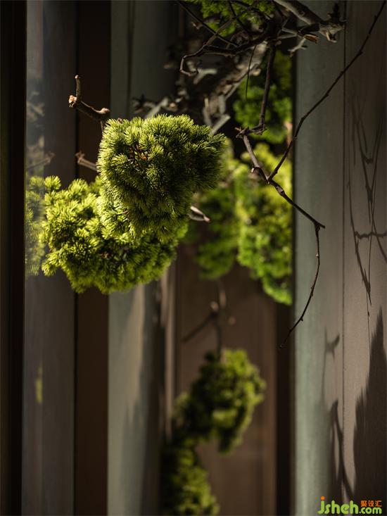 走廊處狹長形的縫隙空間被景觀占據(jù),食客漫步時,落座包廂時,可窺山石松翠,龍吟九品餐廳設(shè)計極少面積的景觀滿足多個包廂的視野需求,移步換景,鬧處尋幽。