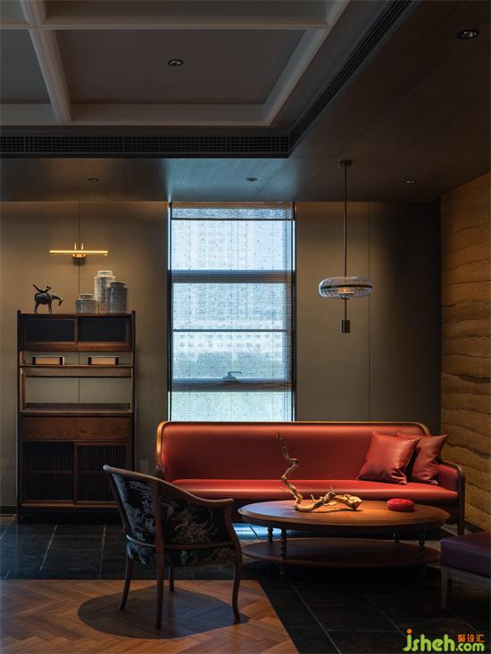 灰色調(diào)的空間中,低奢黑色巖板與暖色桃木色相拼合,朱紅皮革面料活躍于場所中,材料的變化融合新舊元素,傳達(dá)著空間情緒。