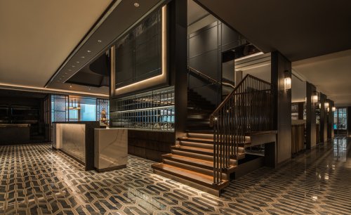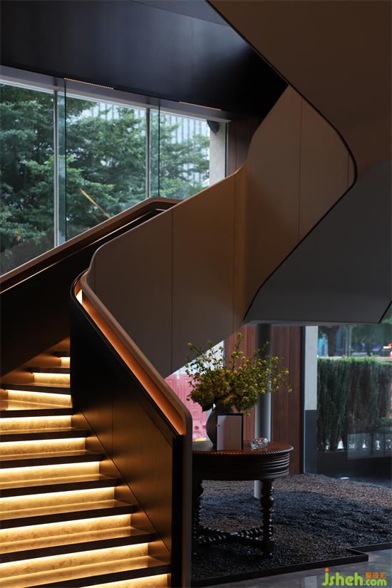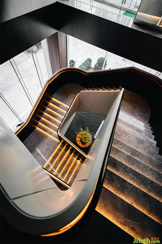 迎賓入門,光影變幻,右側樓梯,盤旋而上,玻璃環(huán)伺,給人第一時間的視覺沖擊,柔和橙光伴隨大理石臺階鋪陳而下。