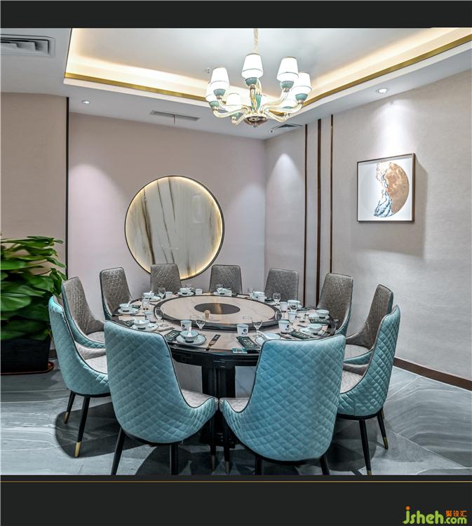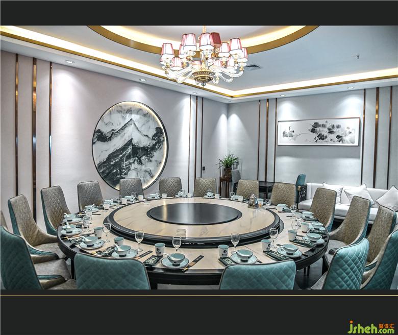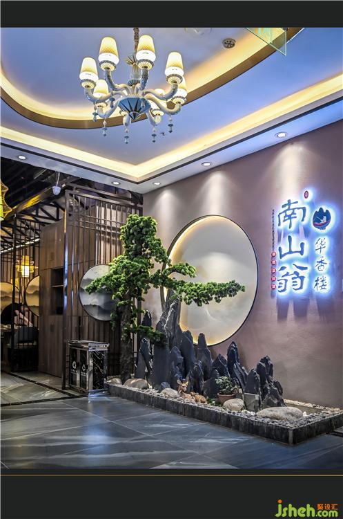 進門處古松與奇石相映成趣,一輪圓月與秀美山色交相輝映,美輪美奐,讓人心曠神怡,食客在進入餐廳之前,就能感受到南山翁希望傳達的“金樽一舉明月落”的古典曠達與詩意。