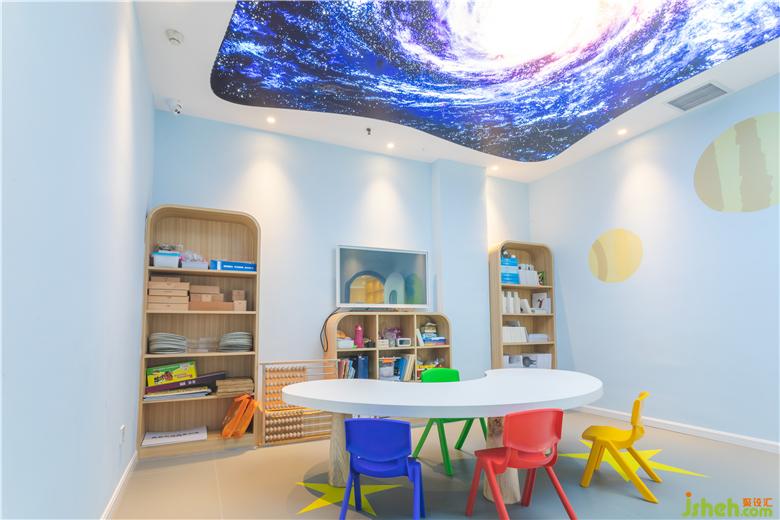大廳的腦力沖擊畫面讓人過目不忘,主題色彩鮮明,過道是藍白交替的科技之門,由門而入,有外太空主題教室(星星)、人工智能主題教室(汽車)、環(huán)境科技(森林)主題教室、未知文明主題教室(迷宮),生物科技主題教室(動物世界)、海洋文明主題教室(海底世界),打開每一扇門,都將進入不同的主題環(huán)境學習,對專注力提升和腦力開發(fā),各有側(cè)重與裨益。