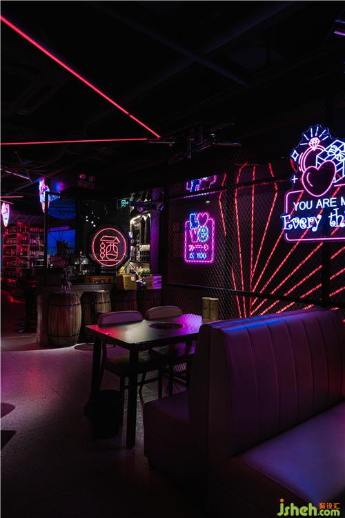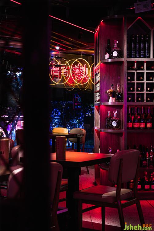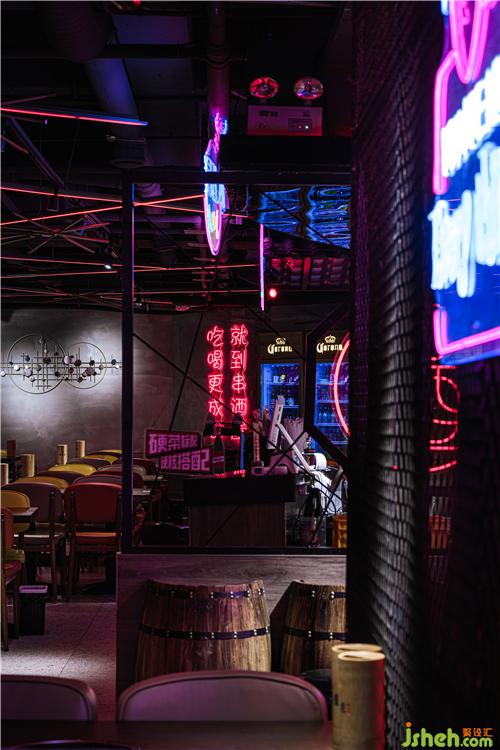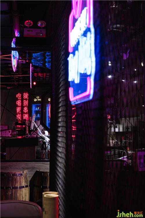 入口處的走廊設(shè)計(jì)采用發(fā)光色的樓梯,壓低自然光線對(duì)室內(nèi)的影響,燈帶的變換,讓整個(gè)大廳充滿著火熱與延伸感。室內(nèi)的燈光情境更加突出了,使入口空間夢(mèng)幻且別具一格。店里的燈具主要采用logo的形狀,充滿著音樂(lè)酒館的感覺(jué),天花的投影設(shè)計(jì)也恰到好處,從現(xiàn)場(chǎng)看燈光的投影照射到每一張桌子,層次感極佳,氛圍感也很到位。
