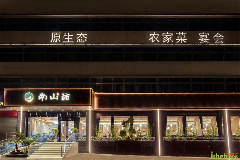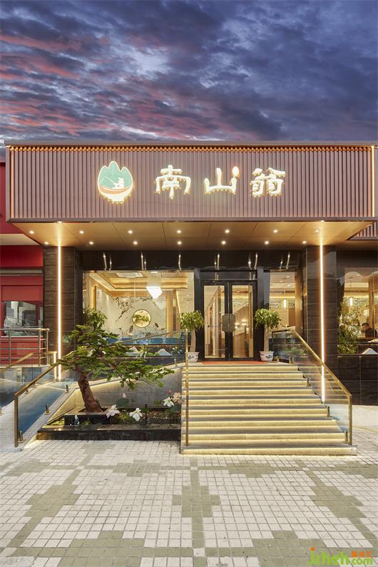 本案在“簡(jiǎn)”與“奢”之間尋求平衡,以新中式輕奢為主體基調(diào),餐廳從外至內(nèi)給人以明亮、大氣之感。夜晚,店門上醒目的金色店名,更有畫龍點(diǎn)睛之意喻。正門的景觀為中國(guó)傳統(tǒng)元素荷花池與迎客松,寓意傳承匠心品質(zhì),喜迎迎八方來客,盡顯傳統(tǒng)文化韻味。