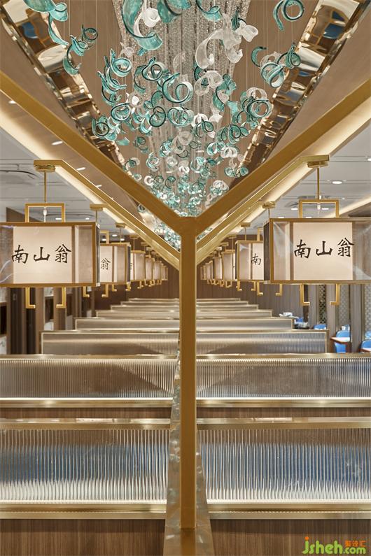 如果一味地體現(xiàn)古文化,會(huì)略顯沉悶。因而采用現(xiàn)代的裝飾材料協(xié)調(diào)搭配,如天然的石材與具有現(xiàn)代感的金屬材料、原木色的墻面與精致的藝術(shù)玻璃等。搭配大量的吊燈、水晶和光滑的大理石地面,使主廳的空間充滿光感與反射,別具一格的裝潢,典雅大氣。