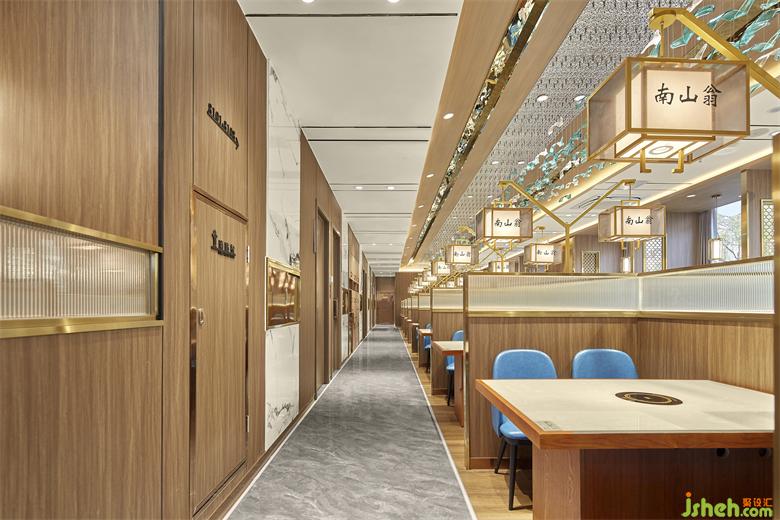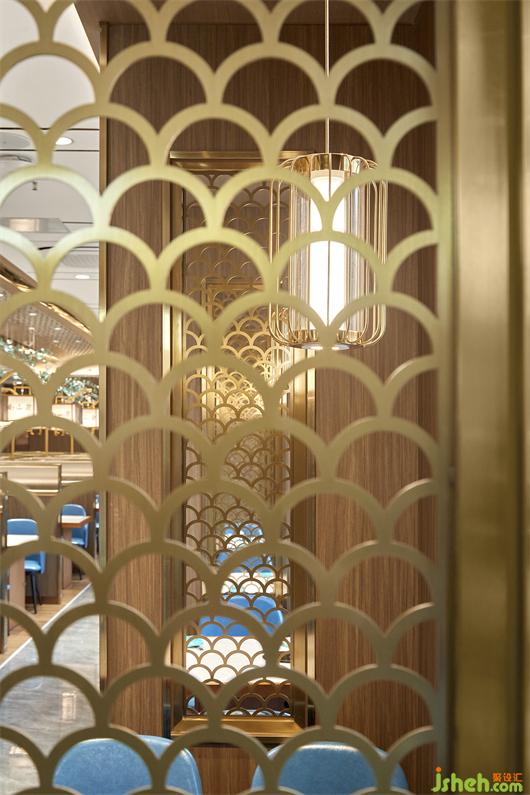 在開(kāi)放的餐桌之間,設(shè)計(jì)師都運(yùn)用了半高的木質(zhì)隔擋形成卡座區(qū),把空間介于“隱”與“顯”之間,而隔擋上的藝術(shù)玻璃,則增添了感知層次和視覺(jué)趣味??拷斑叺目ㄗ?,設(shè)計(jì)師采用了鏤空魚(yú)鱗紋隔斷屏風(fēng),這是將傳統(tǒng)文化抽象成簡(jiǎn)單的圖像符號(hào),融入空間之中。