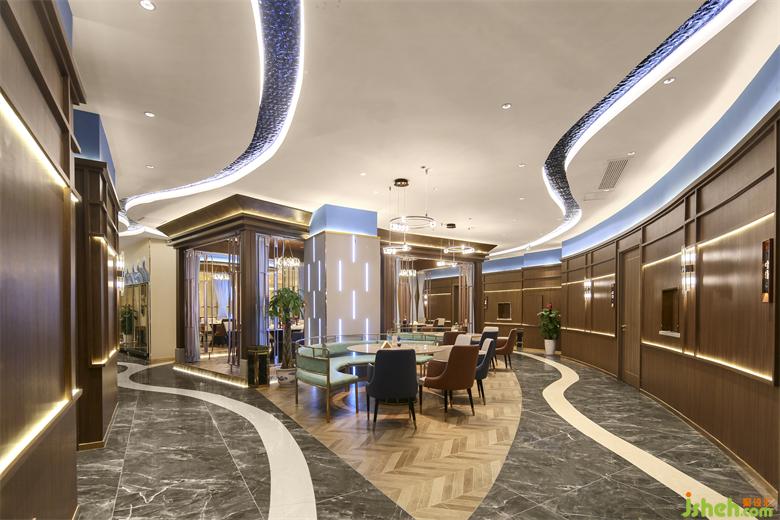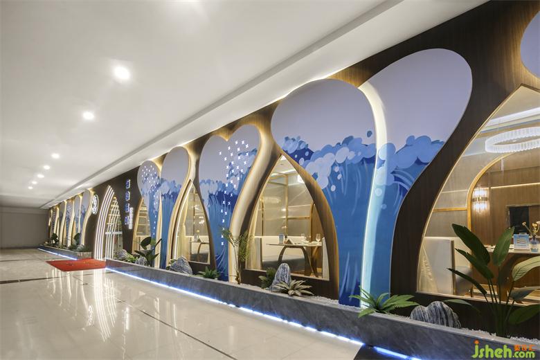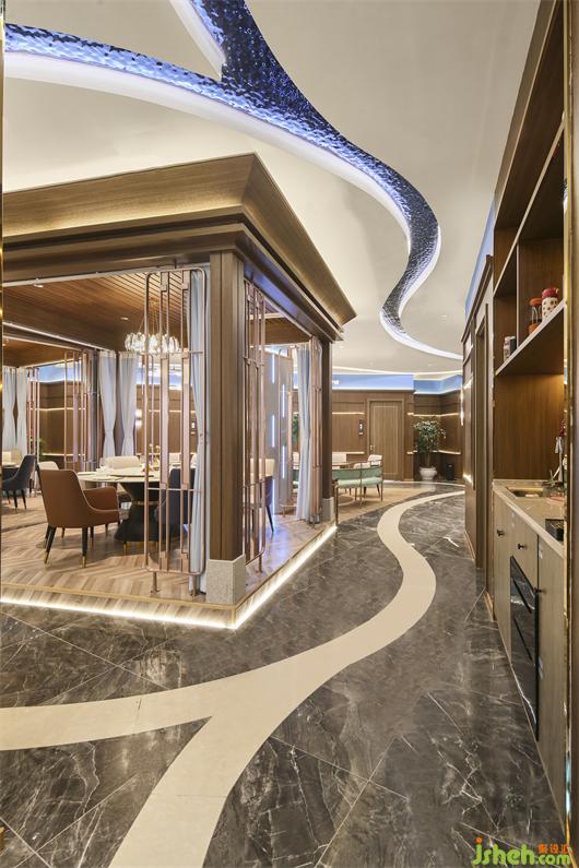 連接各個空間的廊道則由藍(lán)色浪潮凝固成靈動蜿蜒的照明系統(tǒng)引路,“奔流”然后在視線盡處消失。海鮮餐廳設(shè)計(jì)綿延之水懸浮于頭頂,指引著地下白色海岸地磚的方向,將一切籠于其下。鋪陳開流暢的室內(nèi)動線,共同鑄就空間的內(nèi)建筑感。
