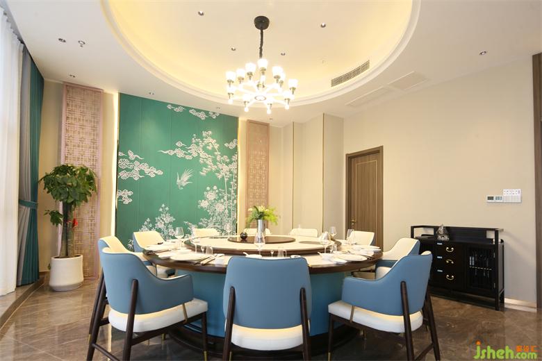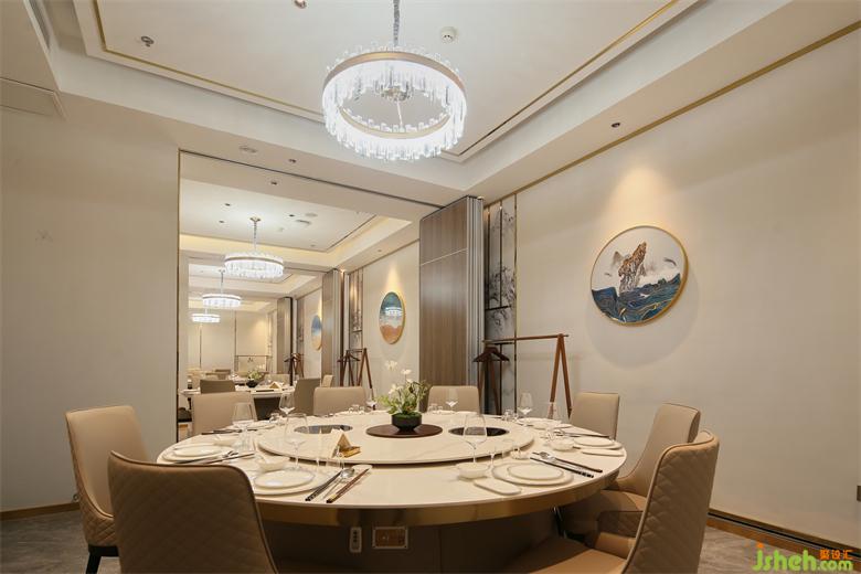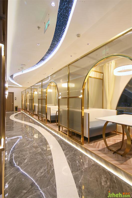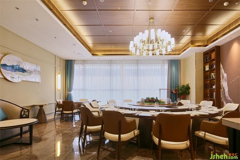 在海韻鮮風(fēng)空間景觀里,深海與大陸的交匯被巧妙地呈現(xiàn)出來(lái)。海鮮餐廳設(shè)計(jì)空間以海洋元素為本,又以人文氣息與空間藝術(shù)為底蘊(yùn),在造型上以垂釣式的吊燈為主,輔以射燈或筒燈等,營(yíng)造一方層次分明的“光彩”空間,為空間注入輕盈明亮的氛圍感。豐富的紋理傳遞出細(xì)膩的質(zhì)感,讓空間于細(xì)微處?kù)陟谏x。