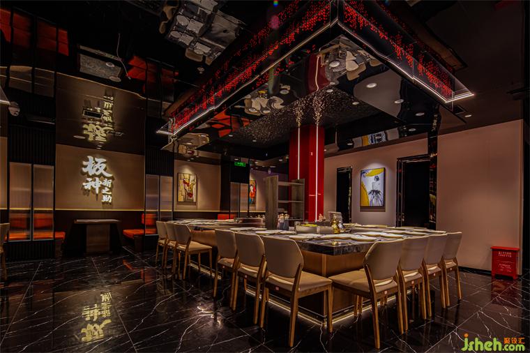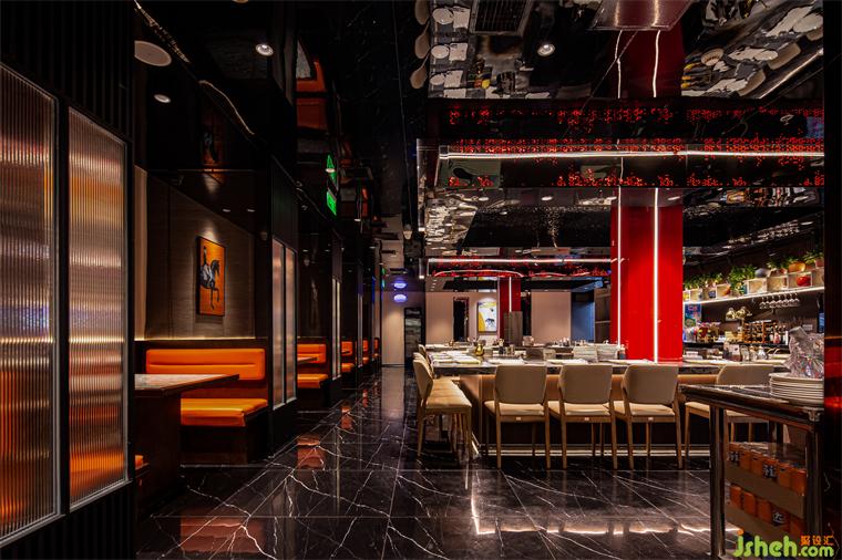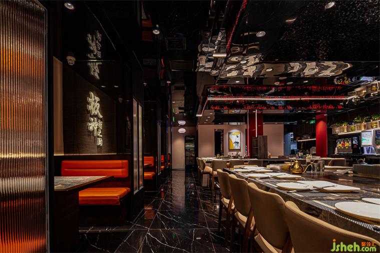 本方整體的硬裝上提取自然的大地色調為設計語言,并結合屋頂紅色方塊,點亮空間色彩,鐵板燒設計多種材質運用,天然紋路理石、工藝精良的金屬、侘寂自然的材料,意在彰顯空間的流動之美。