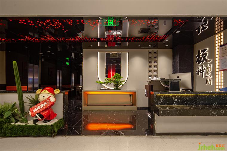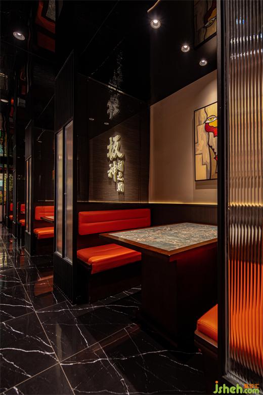 門口升騰火焰的壁爐是點睛之筆,增加用餐氛圍的煙火氣,與橘黃色不規(guī)則的燈光映照下,里面有著無盡的富藏和溫度,與“板神新之助”的logo相呼應,帶來神秘純粹的意境。