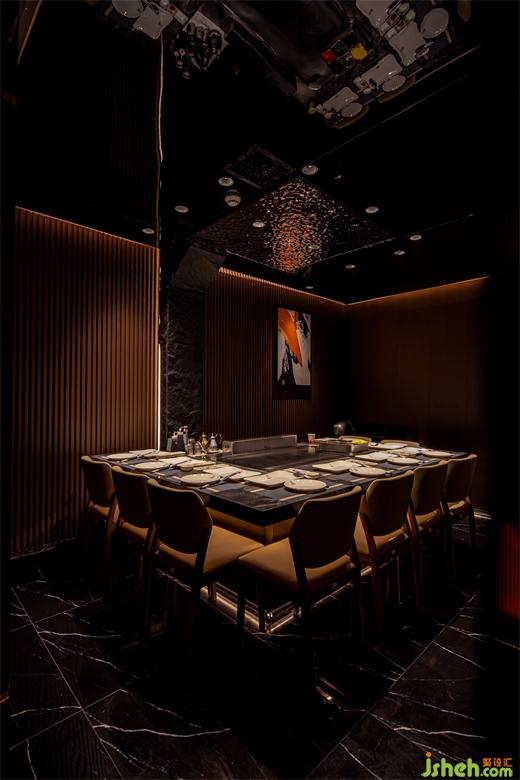 餐區(qū)延續(xù)吧臺(tái)面的大理石桌面,溫潤(rùn)與堅(jiān)硬的碰撞,搭配半包圍的皮質(zhì)座椅,深淺色調(diào)的穿插設(shè)計(jì)增加更多的視覺層次,打造出有溫度的平衡感。映襯著屋頂?shù)姆叫位鹧婧统壬珶艄?,展現(xiàn)了鐵板的溫度。生活就該是像鐵板燒一樣,炎熱熾盛的樣子,昂揚(yáng)向上。