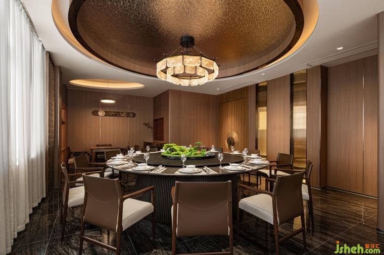 上方的水波紋吊頂,恰似讓泉水面粼粼的波光。形態(tài)各異的燈具設(shè)計,通透的竹子圖案、藤編的造型、褶皺紙面的質(zhì)感,讓人不禁聯(lián)想到瑯琊山上的一草一木,以及草木制成的畫紙。金屬材質(zhì)的古典紋樣屏風(fēng),營造了若隱若現(xiàn)的朦朧意韻。墻面詩詞的內(nèi)容畫卷遙相呼應(yīng),描繪滁州的山川河流,增添了空間的藝術(shù)感。桌椅的材質(zhì)采用天然木材,保留原始紋理,質(zhì)樸中透著自然之美,搭配桌面的花藝微景觀點綴,仿佛置身于滁州的山野之中。