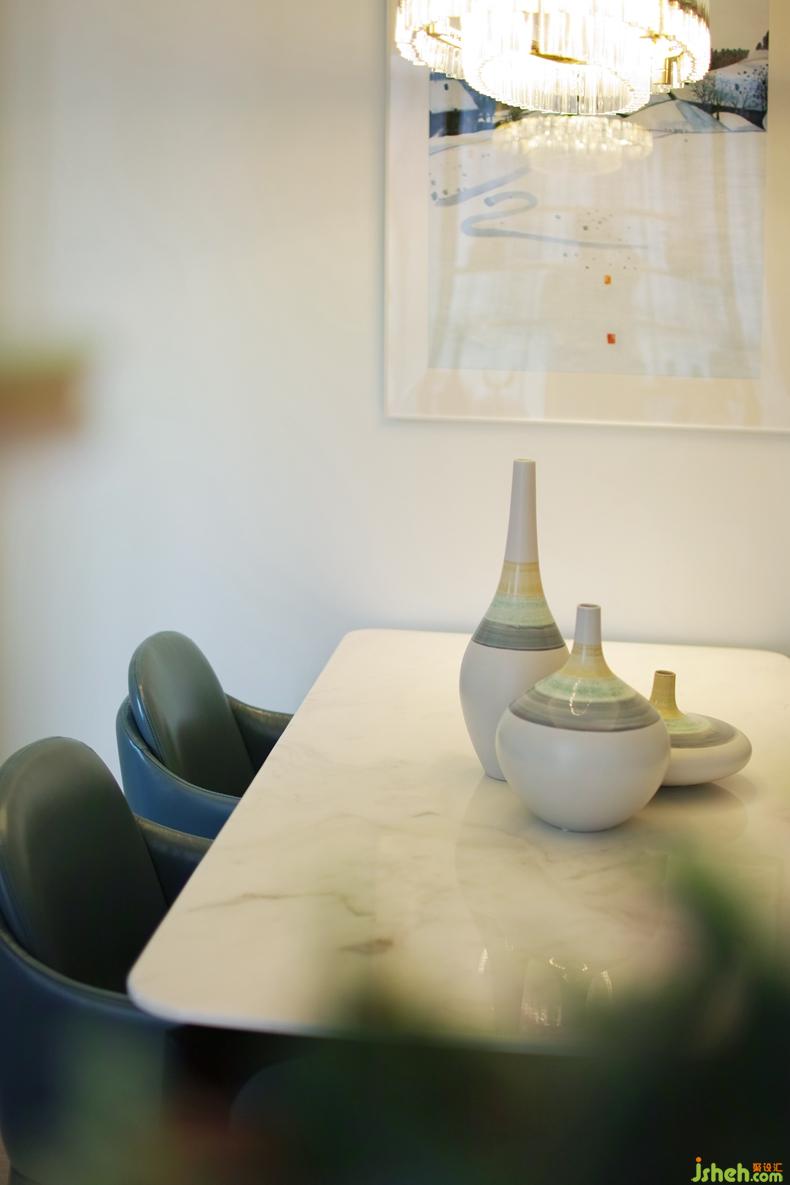 只見高亮的香檳金色和一抹詩意的藍色山景畫,不但大器又壓場,而且也讓空間里的湖藍色,既有旋律變化卻不顯得突兀?!更c睛,就在乎這一點,呼之欲出的應(yīng)和?!?