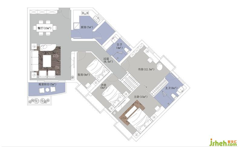 1、原有部分過道歸納為書房,縮短過道長(zhǎng)度,走廊盡頭掛裝飾畫,美觀又方正;
