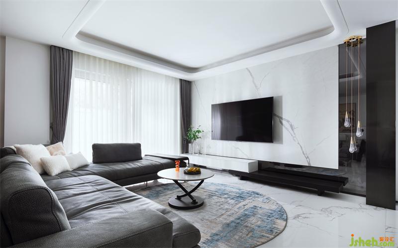 黑色金屬與潔白的大理石碰撞形成強烈對比,原木墻板一掃極簡空間的清冷,空間建筑貫穿式架構結合輕松的柔和色調(diào),引入自然采光通透明亮,配上簡潔藝術掛件,盡顯簡潔自然高品位。