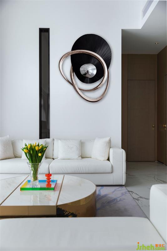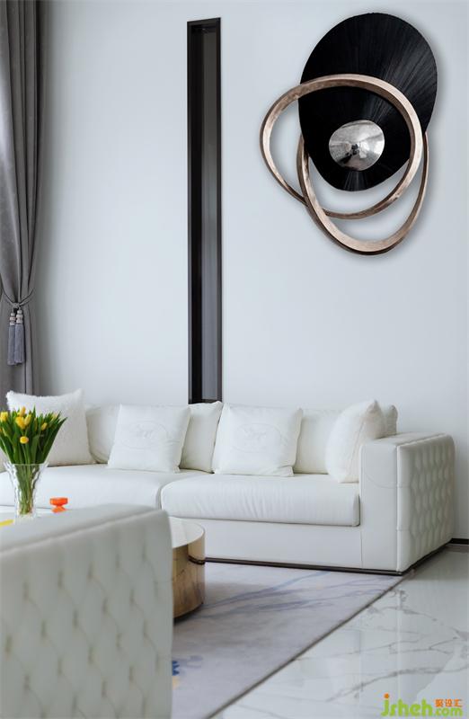 飛舞在米白色柔軟的沙發(fā)組合上空,上下呼應呈現(xiàn)出了強烈的藝術美感,令人沉浸其中。黑色直線的高窄黑玻隔墻打破潔白墻面的無趣,黑白強烈的對比,透過黑??梢酝敢暤饺霊羟皬d的空間延續(xù)感,讓入戶者感受到豁然開朗的儀式感體驗。