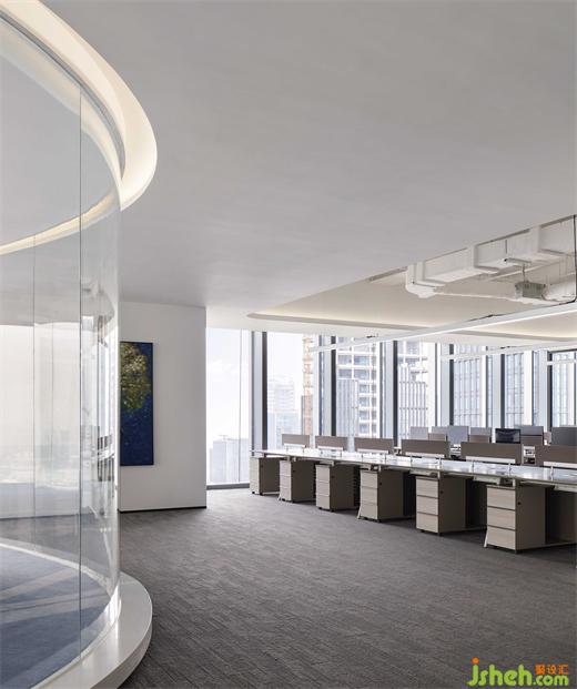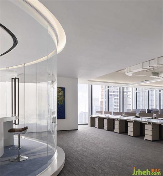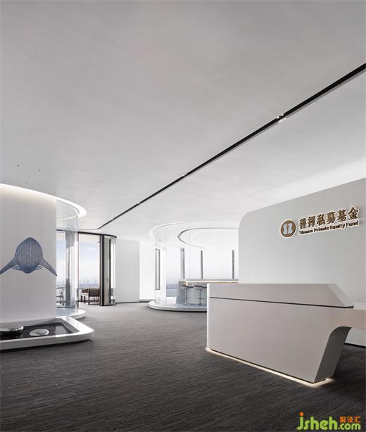 圓的遞進(jìn)、分布,在不遠(yuǎn)處牽引人們的視線。垂直嵌入的兩個(gè)圓形裝置,如鯨魚吐出的水泡,善擇基金辦公設(shè)計(jì)以晶瑩剔透的弧面玻璃為隔斷,保留開闊空間的輕盈感,又豐富了層次,賦予空間想象力。