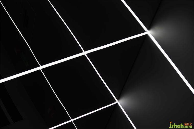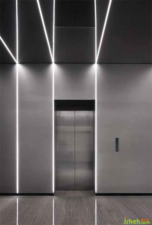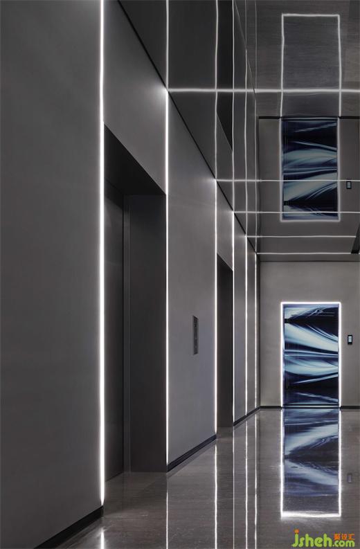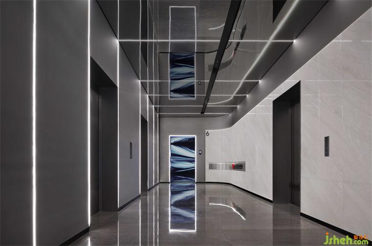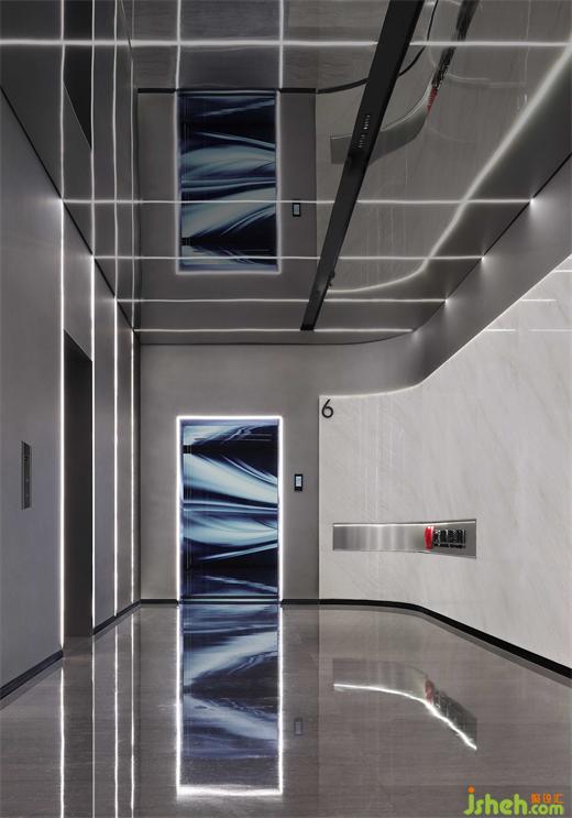 電梯廳通過線性燈條的等比排列、空間色彩明與暗的對(duì)比,重點(diǎn)營造未來感和科技感,隱喻傳統(tǒng)裝飾企業(yè),在煥新發(fā)展理念、運(yùn)用新科技的高質(zhì)量發(fā)展道路上的探索和迭變。