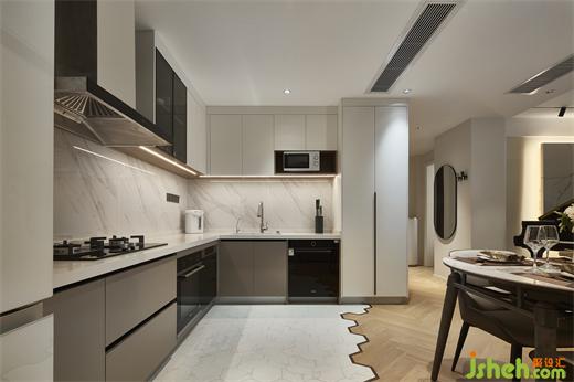 L型設(shè)計(jì),大幅度減少下廚折返次數(shù);白色與木色分離曲線使得廚房更具舒適層次感,簡(jiǎn)易一體臺(tái)面,免除多種復(fù)雜操作。