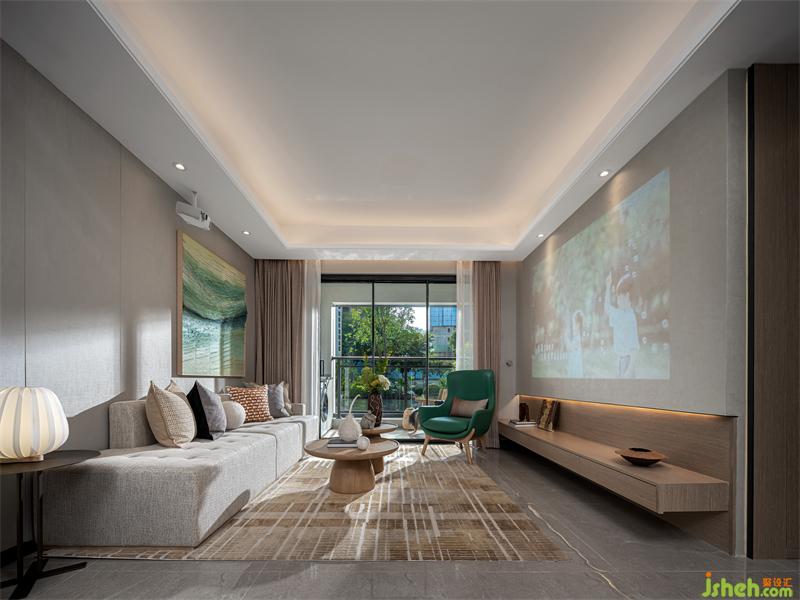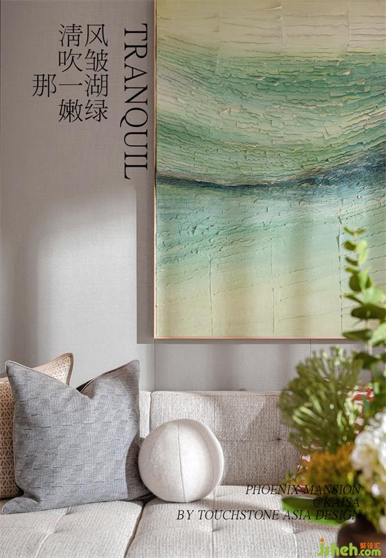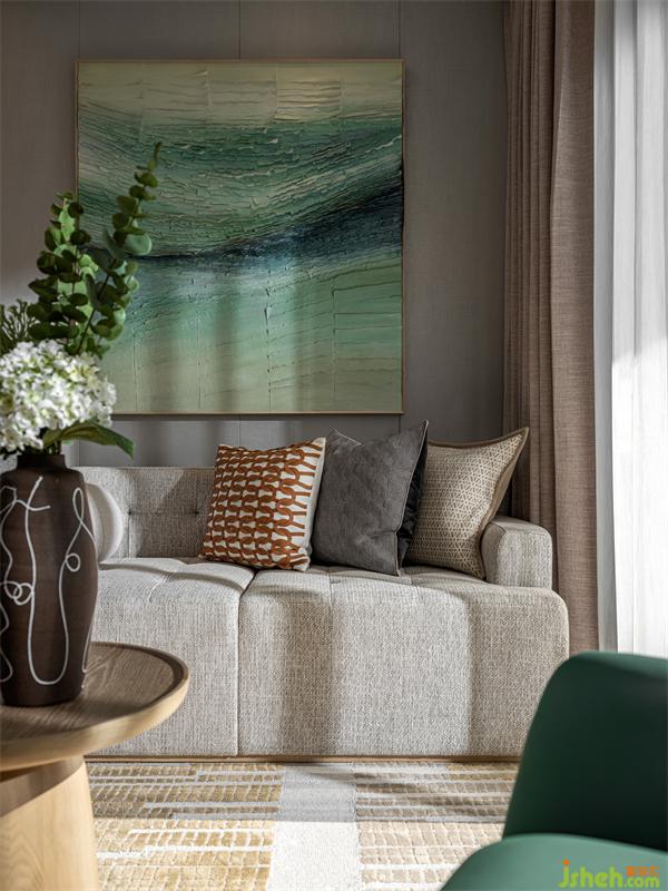整個(gè)硬裝基底為交付標(biāo)準(zhǔn),在此基礎(chǔ)上,我們著力于慢時(shí)光靜生活的一種氛圍打造,拋開風(fēng)格,我們更多關(guān)注的是每個(gè)物料的質(zhì)感、顏色、形態(tài)帶給我們的情感的變化與渲染。我們選用了淺淡的木色與素綿的亞麻質(zhì)地為基礎(chǔ),搭配嫩綠色融入米黃。沙發(fā)背景的立體裝置掛畫,抽象于如風(fēng)吹皺的湖面,波光漣漣交叉,與對(duì)面墻面的投影相互映照,而茶幾上,正是在湖畔閑看春來(lái)秋去的無(wú)所思的人兒。