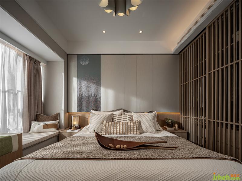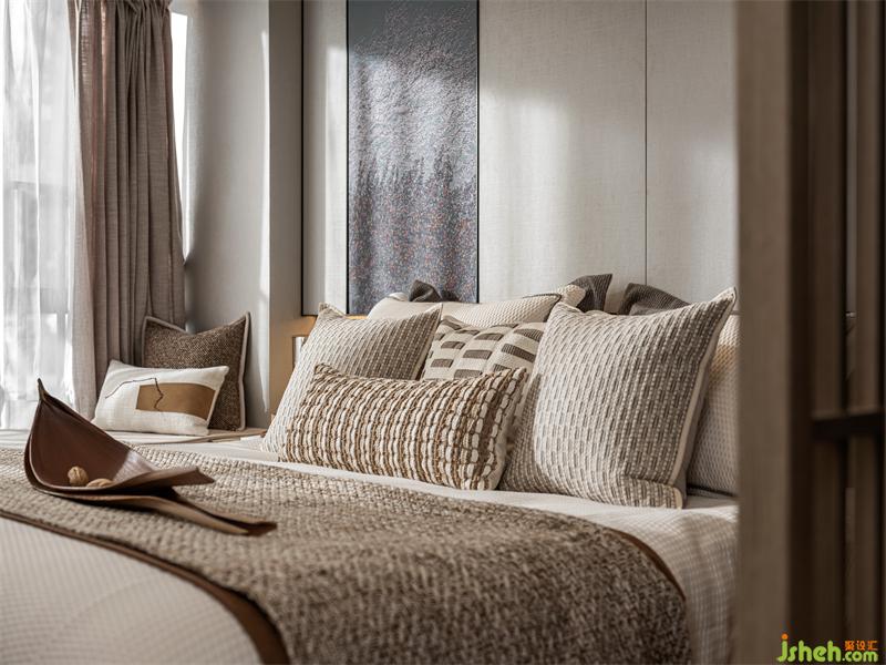 “綠水青山,一輪明月林梢過。石女高歌,古調(diào)無人和。”床頭背景我們樣板間設(shè)計(jì)了一個(gè)手繪墻布,旨在描繪一種月色撩人的情景:臥室窗外月上樹梢,微風(fēng)輕撫,湖光映照,床前夜品香茗,柔和的燈光與月光融為一體,輕照著歲月輕照著你,漸入微夢。