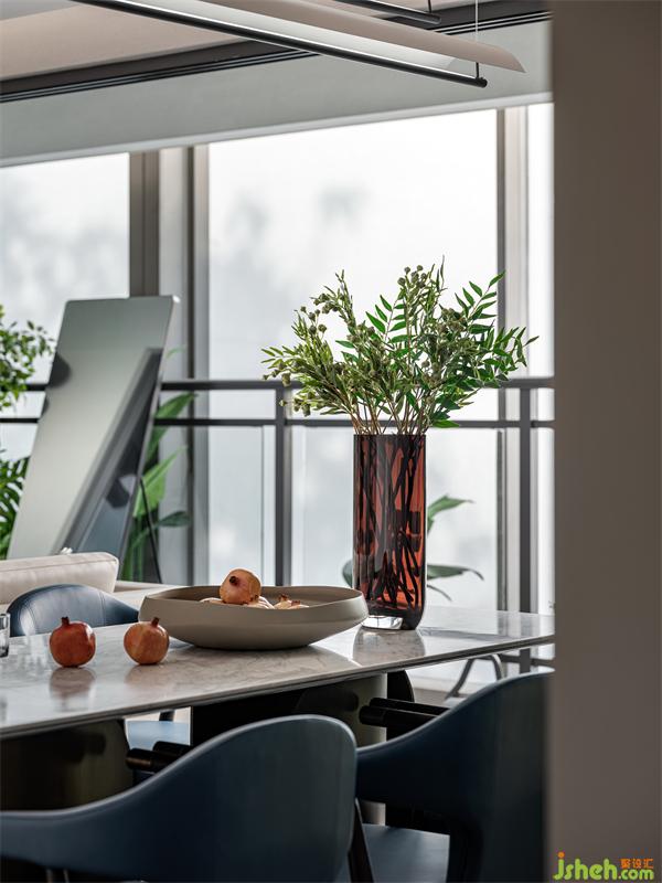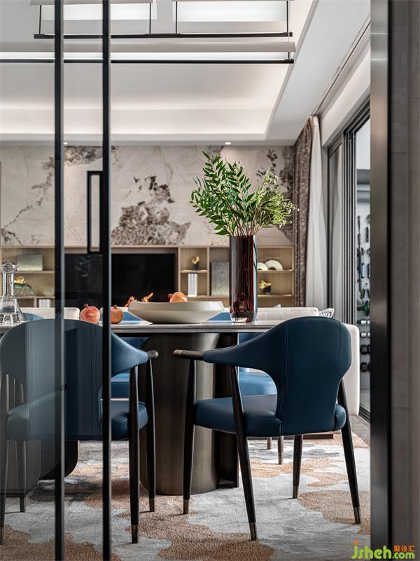 大橫廳的空間設(shè)計(jì),得以上餐廳不再局促,客廳的無主燈設(shè)計(jì),給了餐廳創(chuàng)意吊燈的空間,精致的餐臺(tái),大理石臺(tái)面結(jié)合不銹鋼雙圍合式臺(tái)腳,搭配精工細(xì)節(jié)的餐椅,所有的種種,都是一種人生的態(tài)度,餐椅近乎靛藍(lán) 的跳色,更是一份與生俱來的優(yōu)雅情懷。