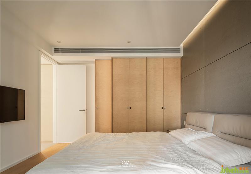 臥室整體延續(xù)了樺木和水泥色的材質(zhì)運(yùn)用,頂面暖色燈帶營造的氛圍消除了水泥的冰冷感。