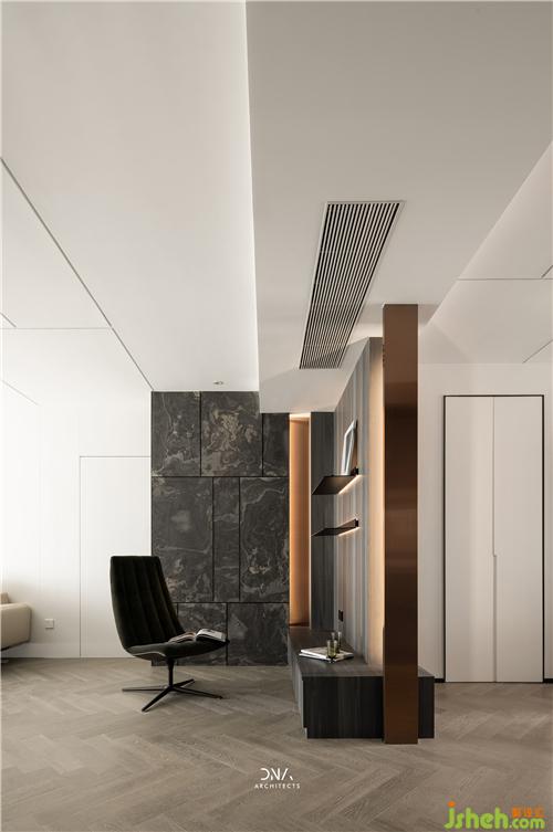玄關(guān)處,通過石材清晰的線條,隱約的紋理,籠罩出一種包容之感,暗黑中的優(yōu)雅,愈發(fā)顯得意味悠長。