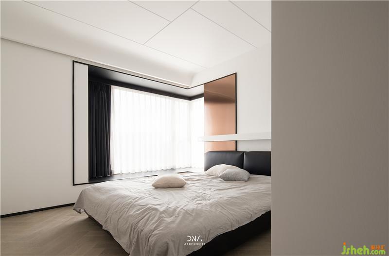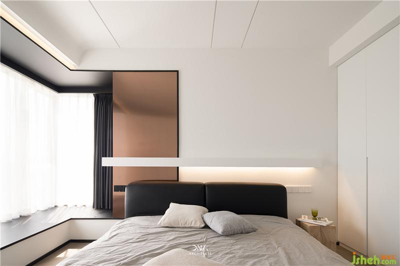 Lines and arc shapes have been running through the master bedroom. The elegant bed background is decorated with large pieces of rose gold, and a handsome demeanor immediately emerges.