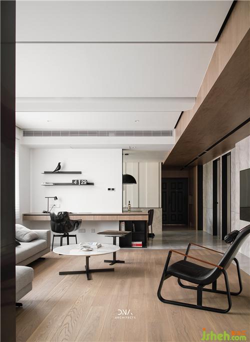 從客廳望去,視線停留之處,立面層疊了各個(gè)功能區(qū)。
