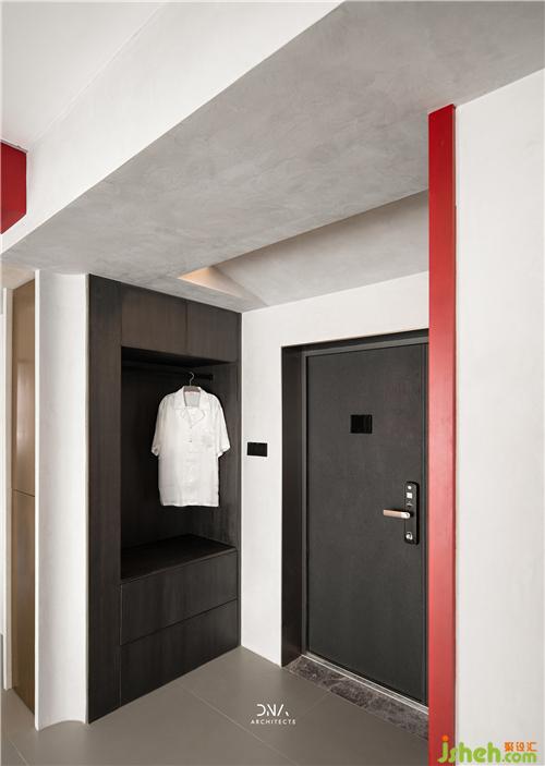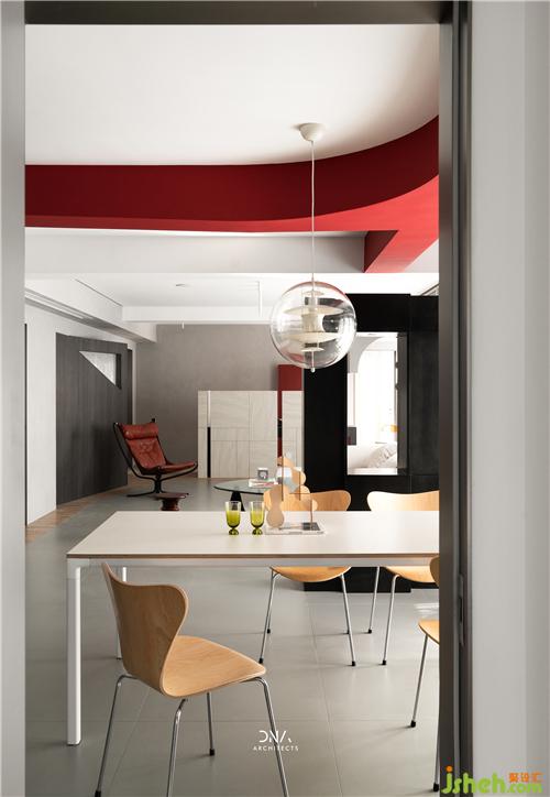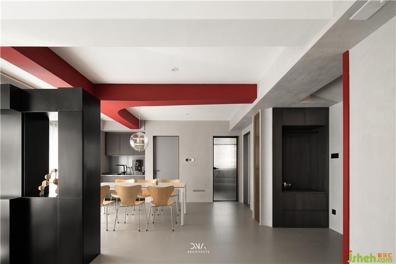 不規(guī)則的幾何線條互相結(jié)合,無(wú)裝飾的立面造型,紅與黑的對(duì)撞色構(gòu)成了一個(gè)自由開(kāi)放的幾何平面,為空間奠定了風(fēng)格基礎(chǔ),為其注入了熱情和溫度。