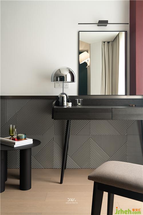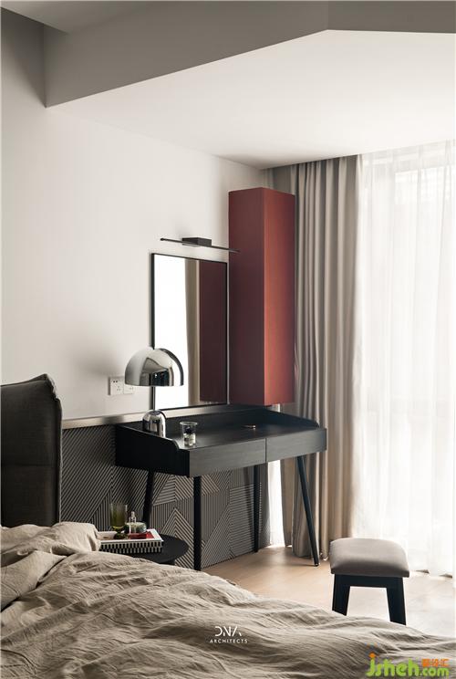 梳妝臺(tái)處紅色與黑色的色彩對(duì)比,增加空間的層次感。