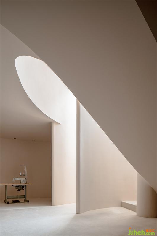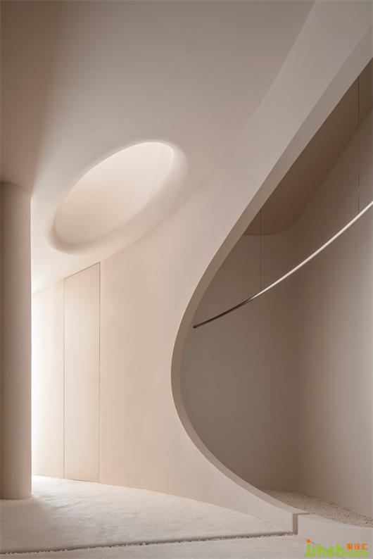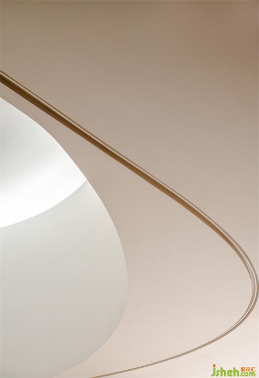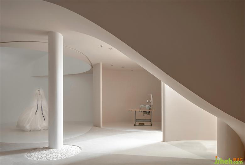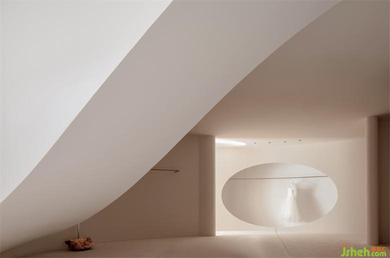 我們想把婚紗作為空間的主體去襯托,而白色作為婚紗的主色系,我們有刻意規(guī)避白色去營造空間圣潔的氛圍,高定空間設計以大面積的裸色去迎合和凸顯婚紗的氣質(zhì)。