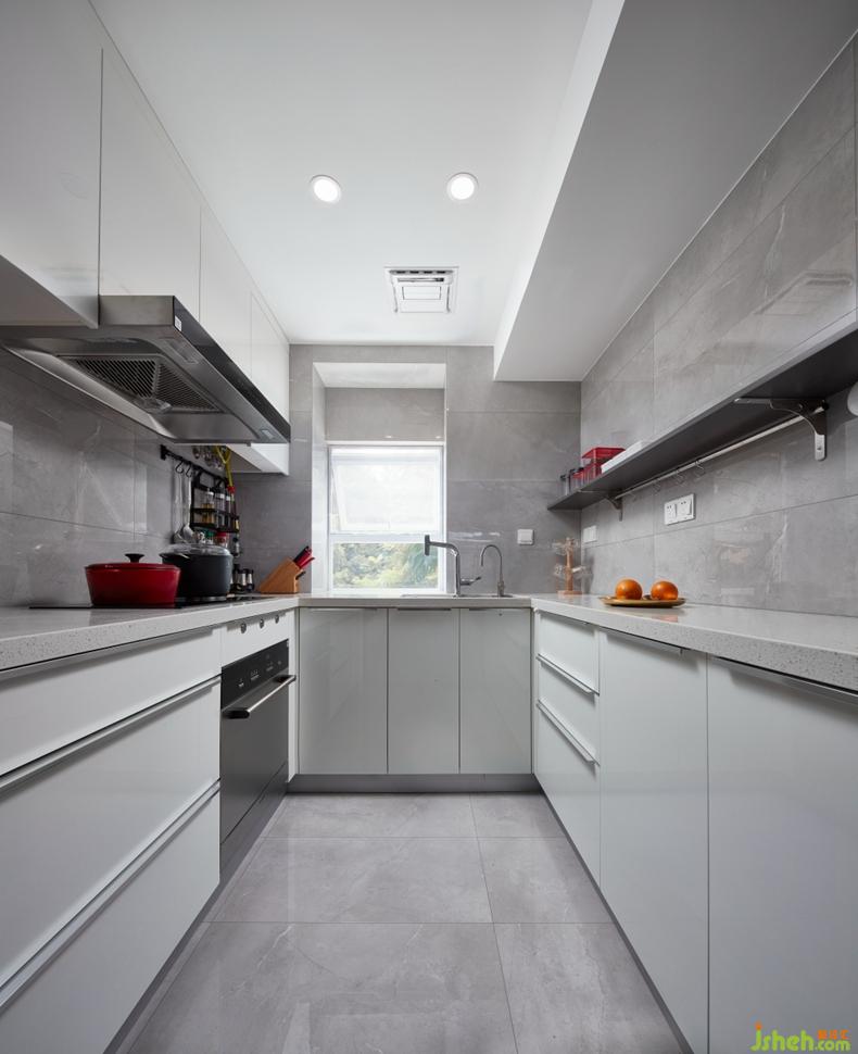 廚房的設(shè)計在極簡格調(diào)體現(xiàn)的尤為明顯,櫥柜臺面柜門全部采用白色烤漆門板,配以不銹鋼本色的一字型柜門拉手,視覺的延展,就像是穿越時光的隧道。墻地面的灰色紋理瓷磚襯托白色無擋水邊的臺面,灰白的搭配可以無遮擋的銜接。