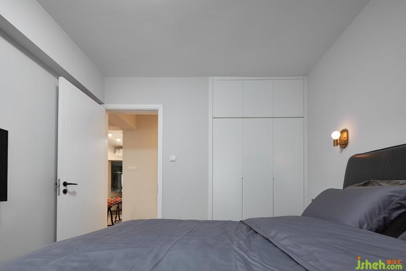 深灰色皮床的格調(diào)與客廳沙發(fā)用料相呼應(yīng),空間的連貫性可以有多樣化體現(xiàn)。床頭兩側(cè)金屬壁燈,可以讓深灰色也不會(huì)顯得壓抑。百葉簾的光照,更加柔和了整體的質(zhì)感。設(shè)計(jì)公司