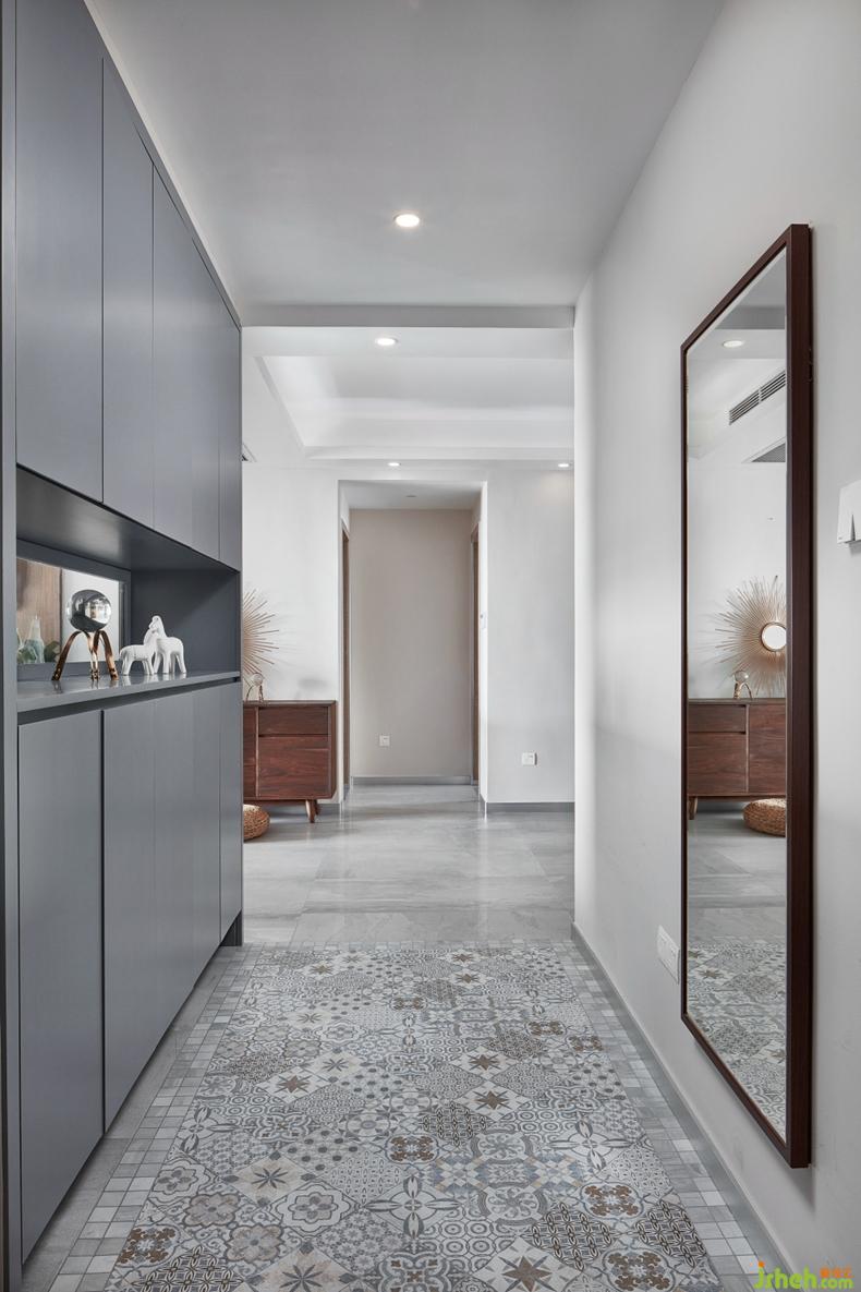 入戶玄關(guān)在保證有大空間的收納功能,又要兼顧到玄關(guān)區(qū)的采光,在鞋柜的結(jié)構(gòu)上解決。中間的鏤空位用加厚的鋼化玻璃,通過(guò)玻璃采光又可以保證結(jié)構(gòu)的穩(wěn)固度。地面磚低調(diào)的灰色花紋與深灰色鞋柜面板呼應(yīng),協(xié)調(diào)的美感就在這一瞬間體現(xiàn)出來(lái)。設(shè)計(jì)公司