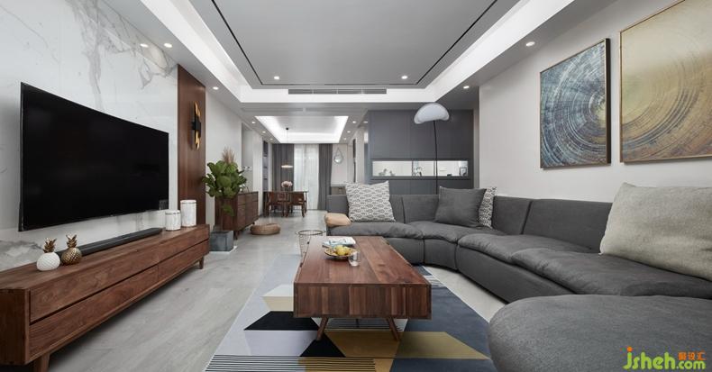 客廳的無(wú)主燈設(shè)計(jì),讓整個(gè)空間的延伸性得到最大化展現(xiàn)。黑胡桃與灰色的融洽搭配,是本套設(shè)計(jì)中始終貫穿的表現(xiàn)。韻律的連貫美學(xué),也在設(shè)計(jì)師表達(dá)中體現(xiàn)出質(zhì)感的輕松愉悅。
