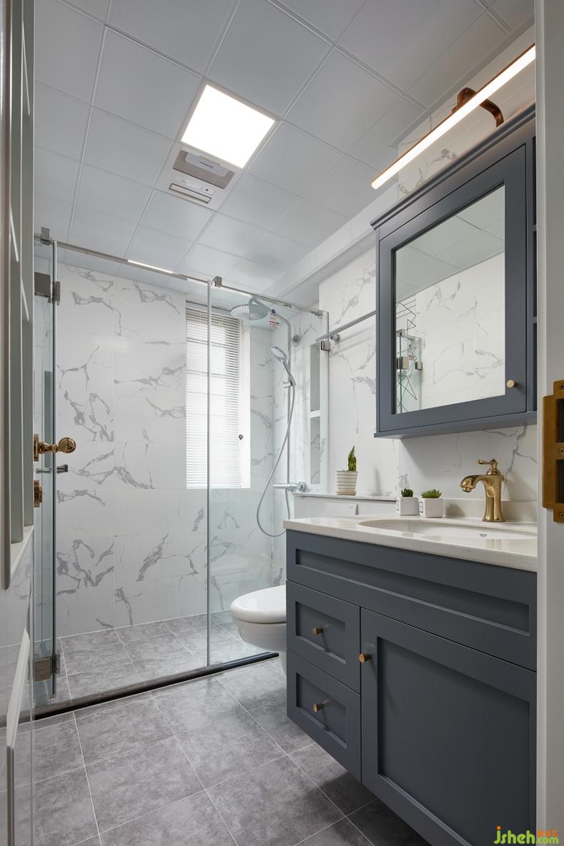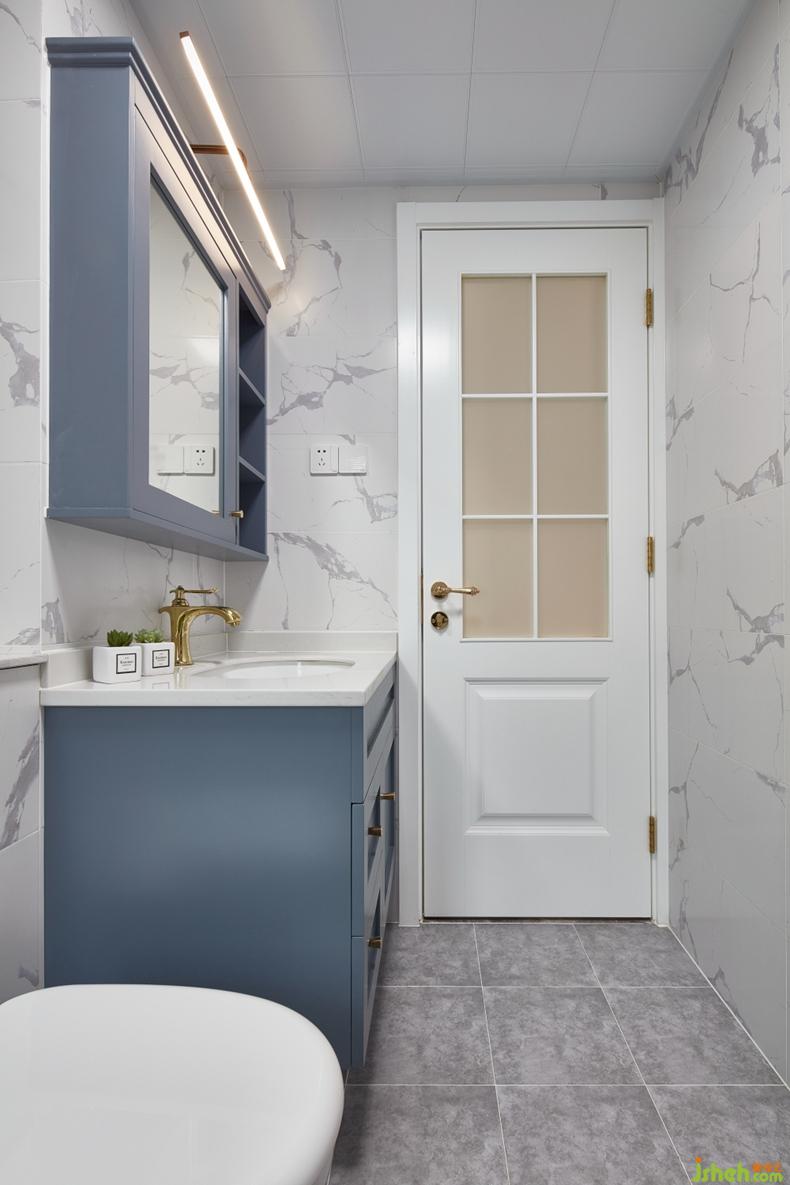 墻面統(tǒng)一的仿爵士白瓷磚,自然的紋理不需要刻意挑選,隨意的混鋪更加能體現自然的延伸。定制的灰藍色洗手臺配上金色水龍頭,此時金屬的質感最容易讓人流連忘返。