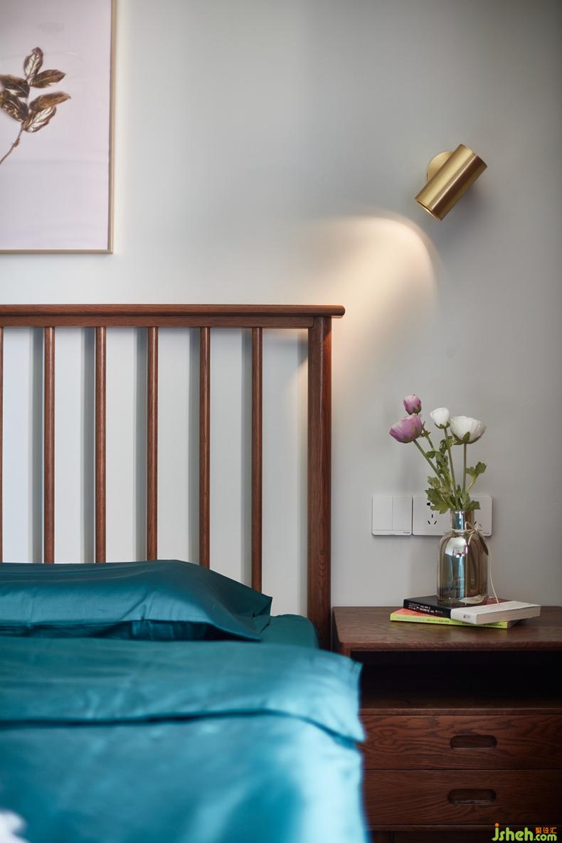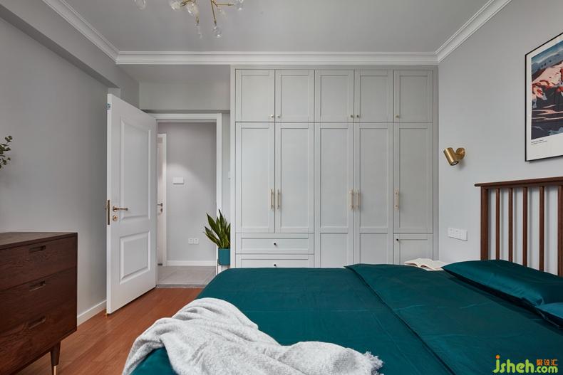 主臥的設計中體現(xiàn)了主人穩(wěn)重內斂的氣質,黑胡桃木色的實木床及斗柜,在墨綠色床品的襯托下顯得更加有質感。金屬的壁燈及裝飾畫框,在灰色墻面上顯現(xiàn)高貴的氣質。