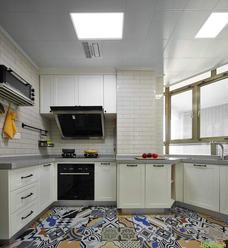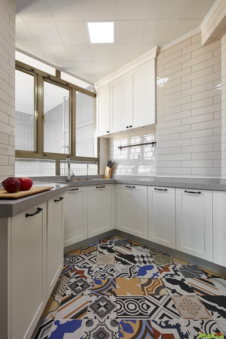 廚房:簡潔的櫥柜門板襯托著墻面長條磚,在設(shè)計(jì)上采用方塊的變幻組合,而地面具有LOFT的花磚,卻給予空間的變幻動(dòng)感上帶來很大變化,廚房的操作空間就不應(yīng)該那么沉悶。