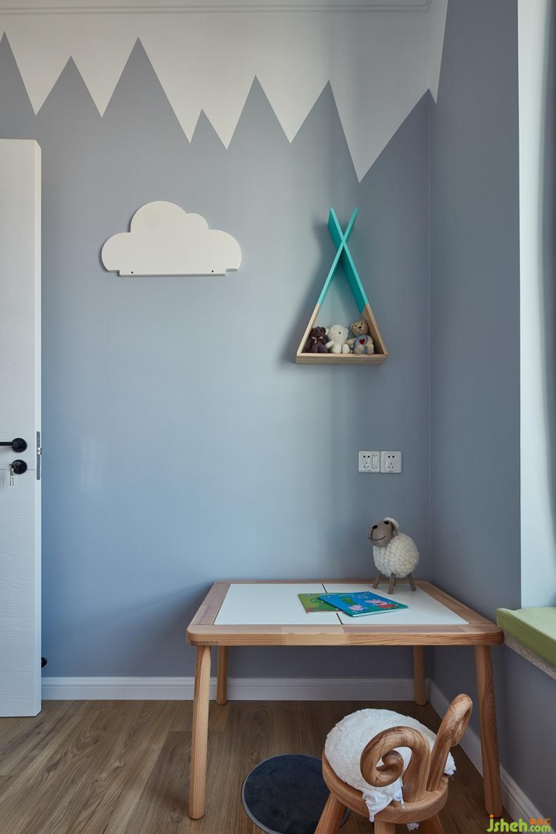 兒童房:墻面在涂料滾涂的上設(shè)計(jì)充滿童趣的幾何圖案,有山的變幻,有白云的浮現(xiàn),有孩子一切的童真幻想。灰色調(diào)的墻面做為背景,粉色可愛(ài)的家具帶給小女孩公主粉的世界。