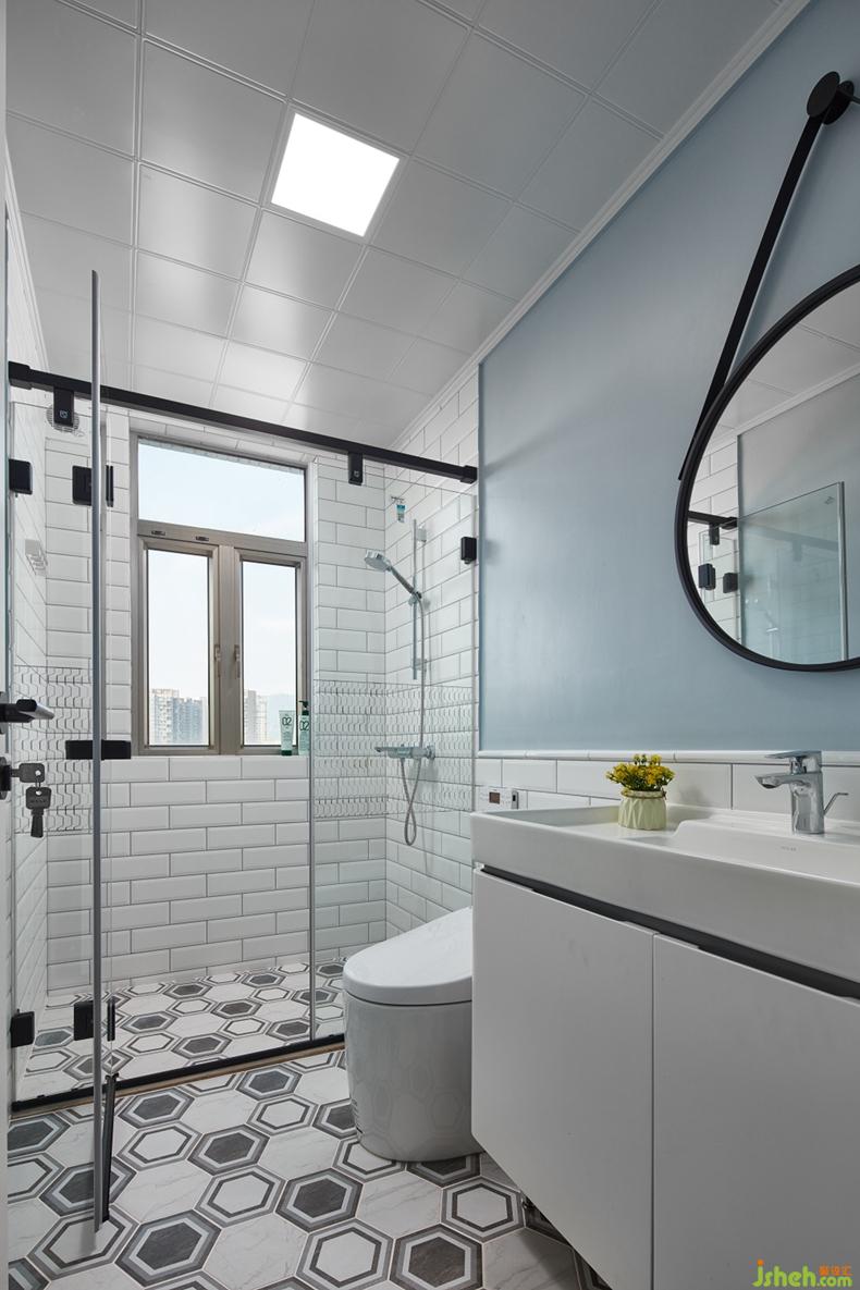 主衛(wèi):在材料的選擇搭配上充分考慮空間的獨(dú)特性,沖涼區(qū)采用滿鋪小條白磚(滿足沖涼的水及潮氣最大的使用區(qū)域),而在馬桶及洗手臺(tái)區(qū)域墻面則采用半高底部貼瓷磚,上半部刷防水涂料,誰(shuí)說(shuō)洗手間就是一成不變的貼磚再貼磚?地面的六邊形磚,圖案的變幻,更加體現(xiàn)出主人對(duì)于生活細(xì)節(jié)的要求。