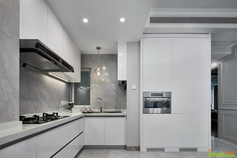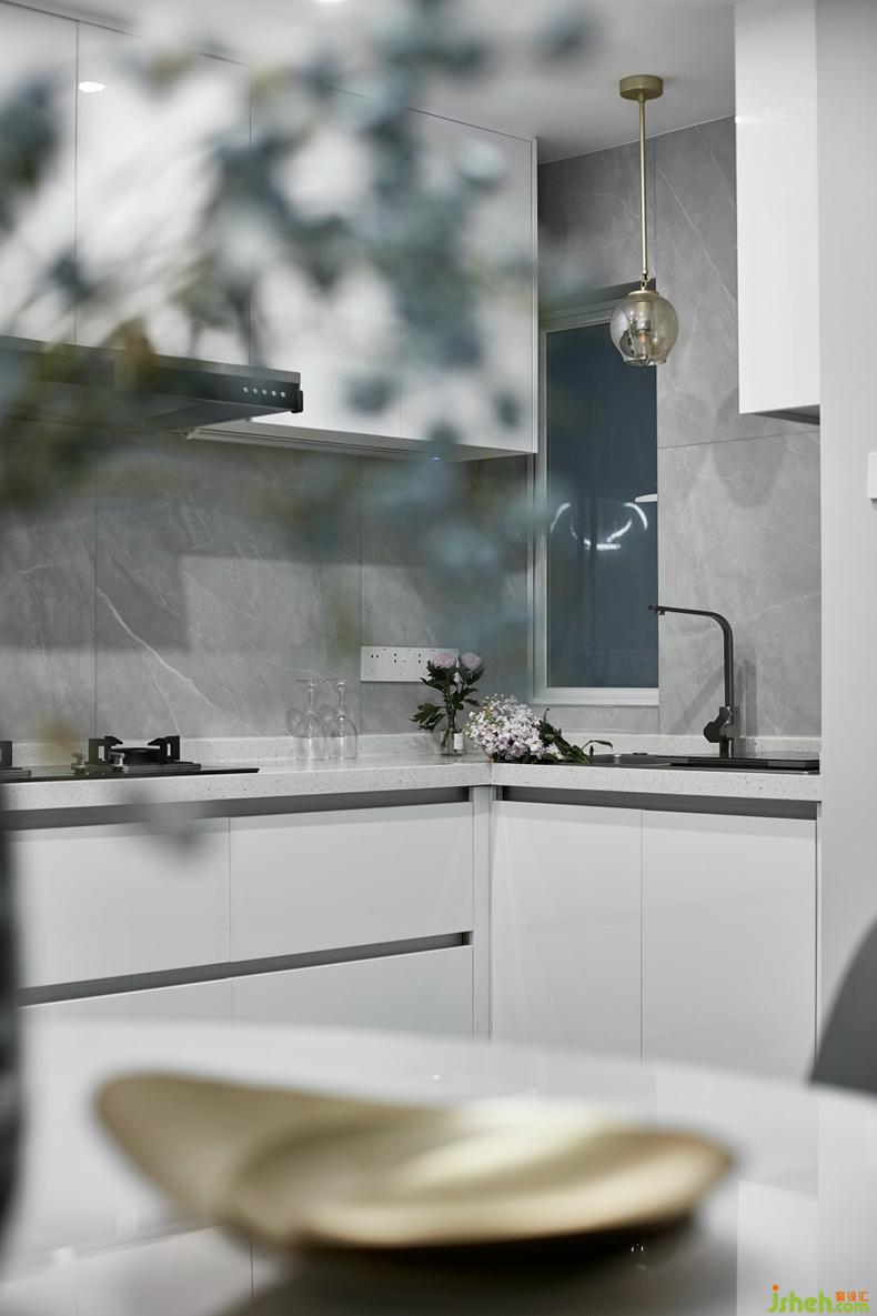 黑白灰,不再屬于男性的專屬標(biāo)簽。在廚房的操作區(qū),女主人常主勺的地方,白色的烤漆板用于櫥柜與隱藏式冰箱組合柜,與墻面及地面的灰色柔光磚,形成沉靜平衡的空間。金屬吊桿配上透明玻璃罩吊燈,猶如一輪皎潔的月亮,讓整個(gè)空間也不再那么冰冷。