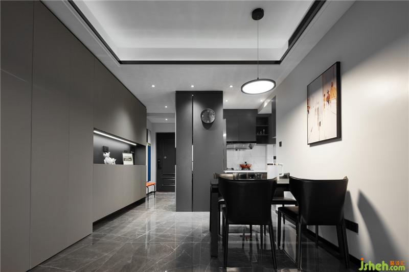 餐廳純黑色的餐桌椅搭配,頂部一個(gè)簡潔圓盤吊燈,光的重點(diǎn)烘托就餐氛圍。餐廳不需要花哨,更不需要燈光過剩。就餐區(qū)燈光的凝聚感設(shè)計(jì),可以滿足餐廳的儀式感。