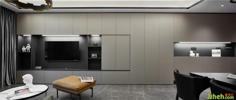 客廳沙發(fā)背景墻的豎塊狀硬包背景,布藝的細(xì)膩質(zhì)感與電視組合柜的硬朗形成對(duì)比。硬包邊上黑色的金屬收邊條又與電視背景柜中的黑色呼應(yīng),視覺的整體效果,需要在材質(zhì),色彩,造型等方面都要全面考慮。